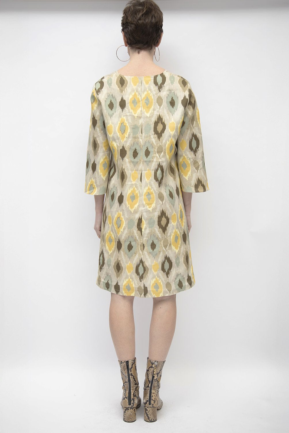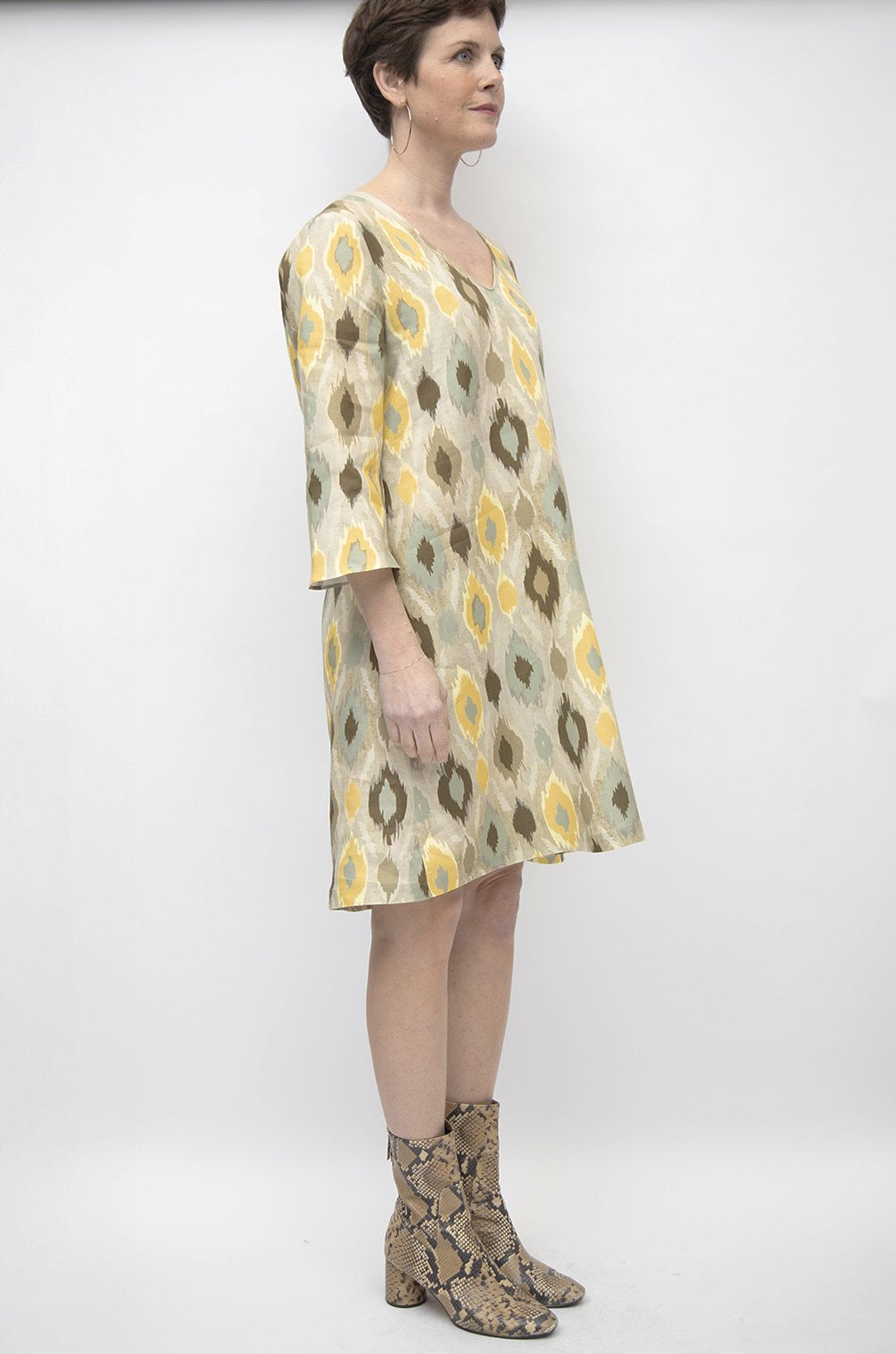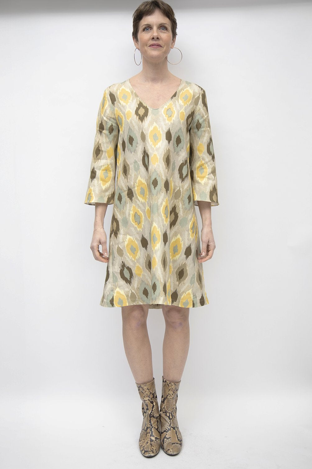 Abito in lino stampato. La linea ad A è ampia, morbida, svasata, tagliata in dritto filo per non segnare i fianchi, lo scollo è a V. Le maniche sono svasate sul fondo,a campana.