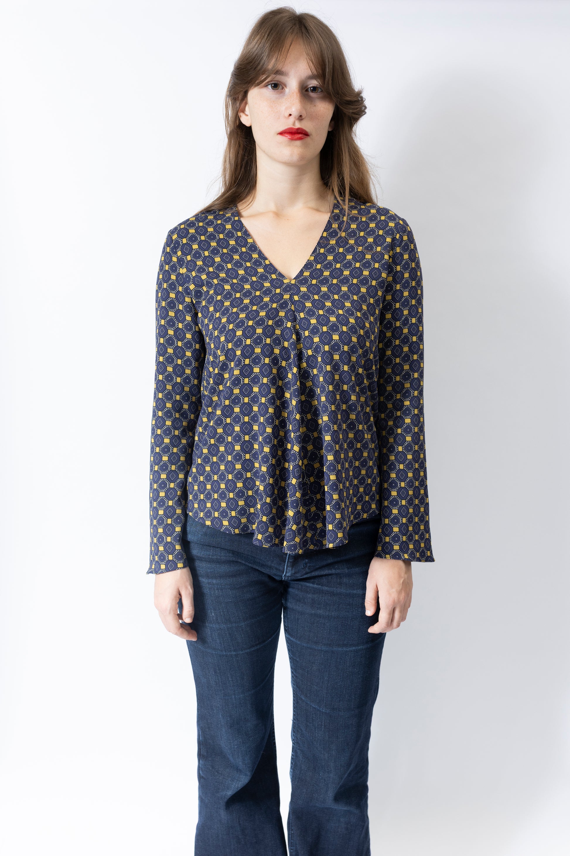 Le due parti del davanti della blusa sono tagliate in sbieco formando il piacevole movimento e la morbidezza che si vede nel capo indossato.La schiena è tagliata in dritto filo e definisce leggermente la figura.