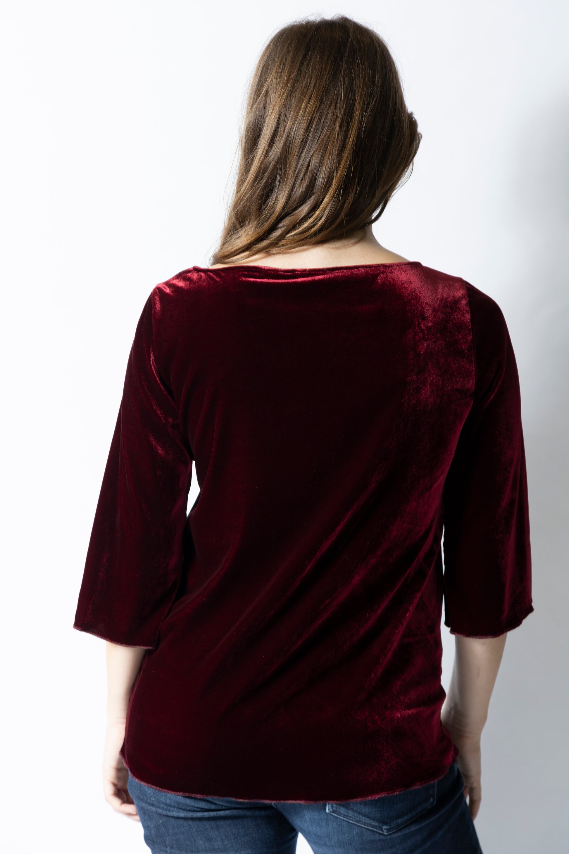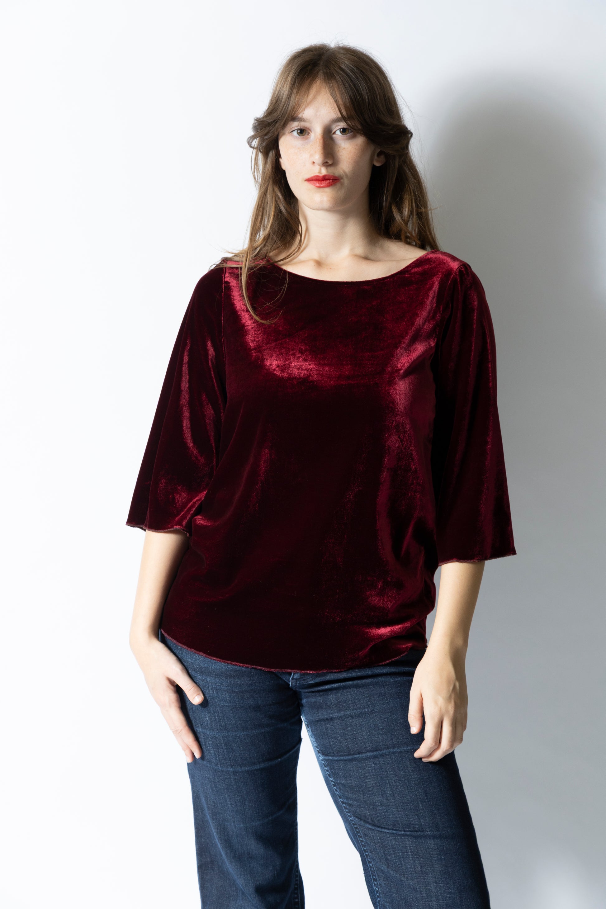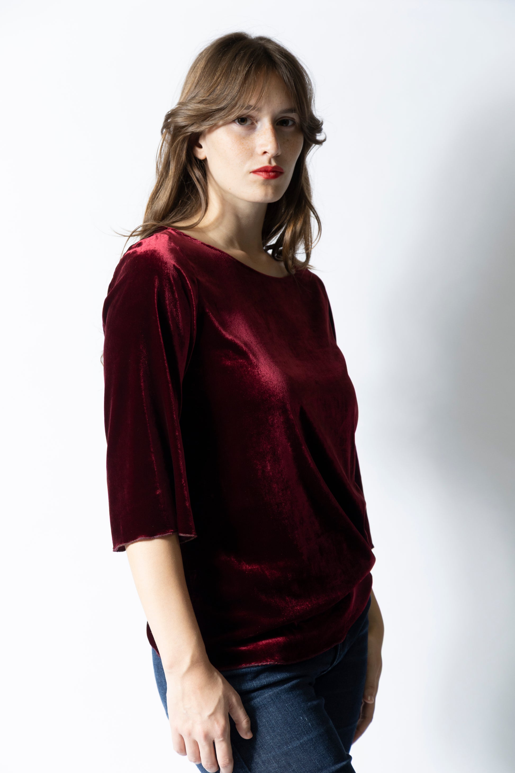 Una blusa semplice in vettuto di seta stretch tinta unita ordinabile nei colori : bordeaux, nero, testa di moro, blu, verde militare.