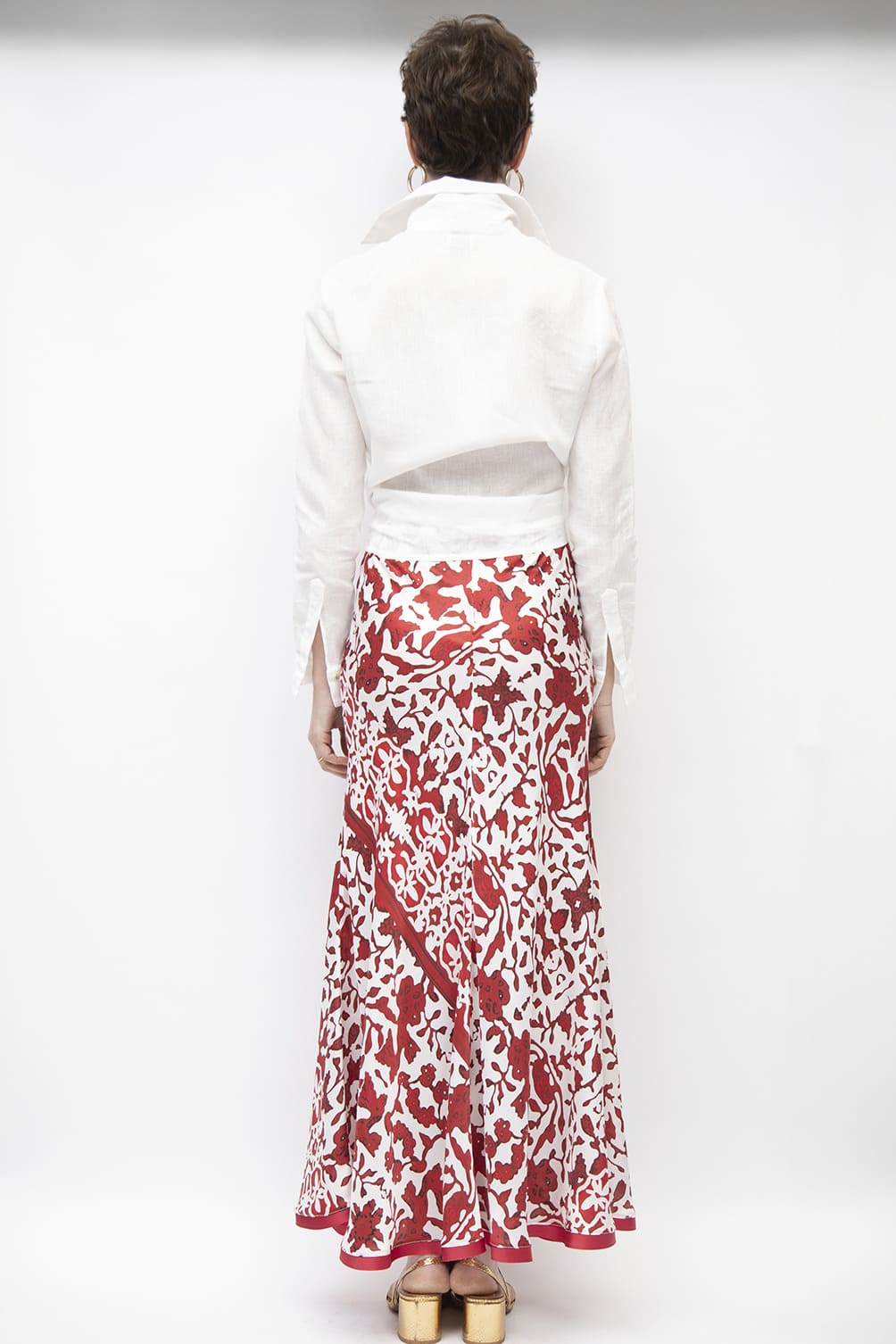 Gonna morbida e cascante a mezza ruota in un morbidissimo tessuto misto seta stampato.