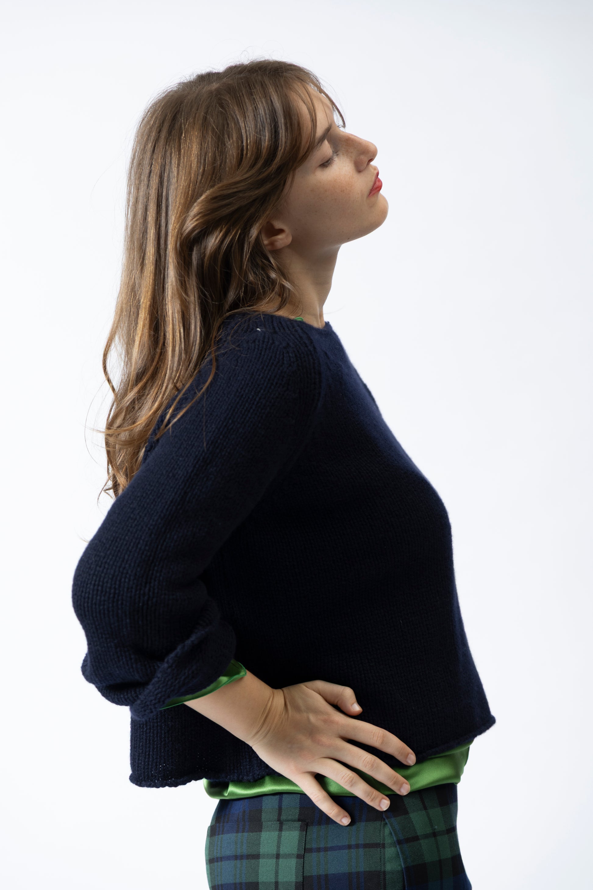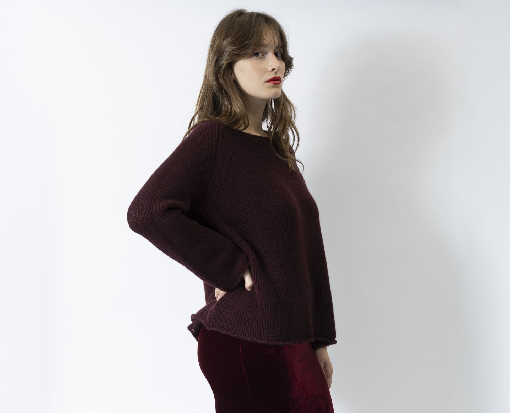 Maglia in puro cachemire morbidissimo a tre fili con scollo a giro allargato sui lati, la linea è svasata , la lunghezza al fianco, la manica è a raglan leggermente svasata.