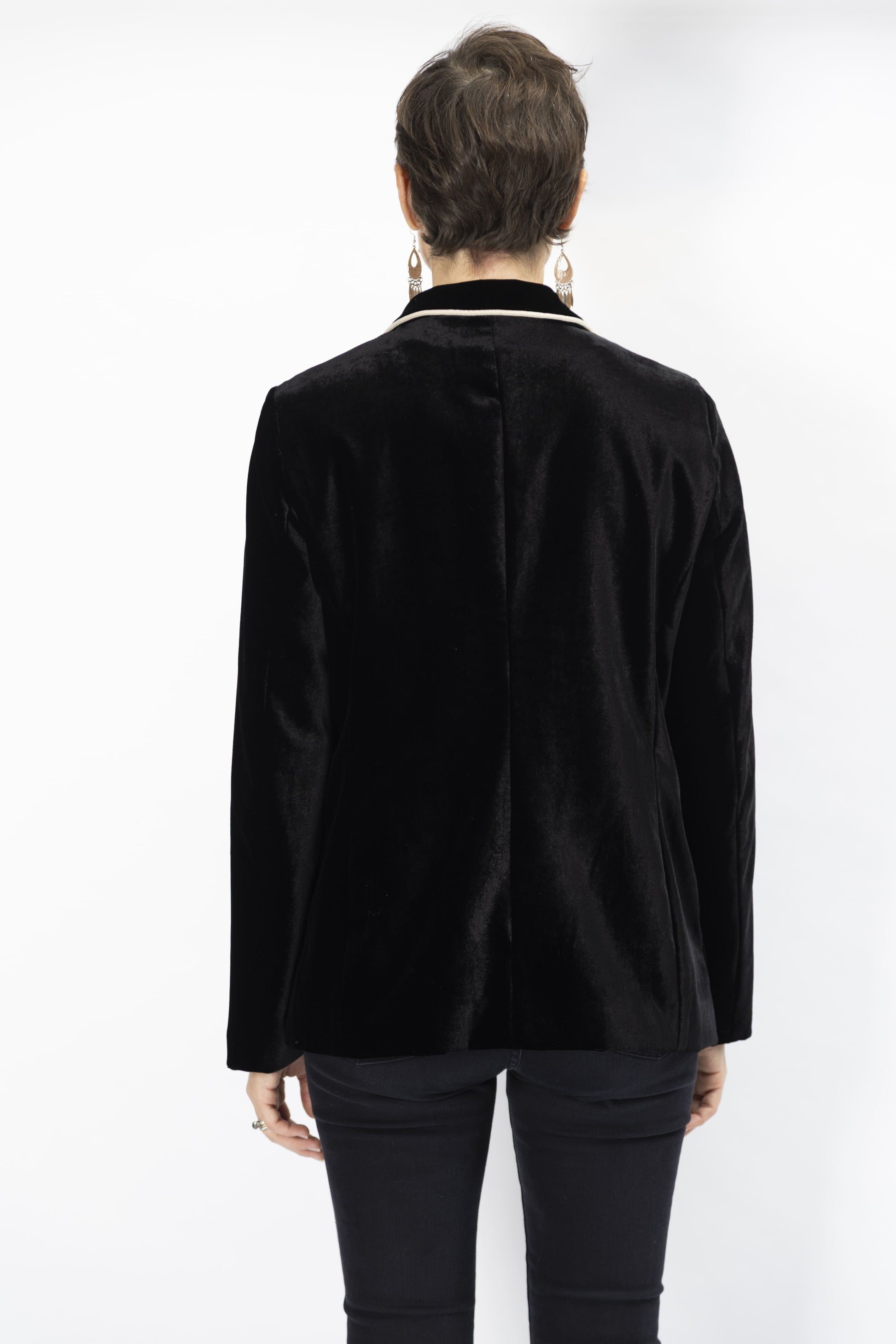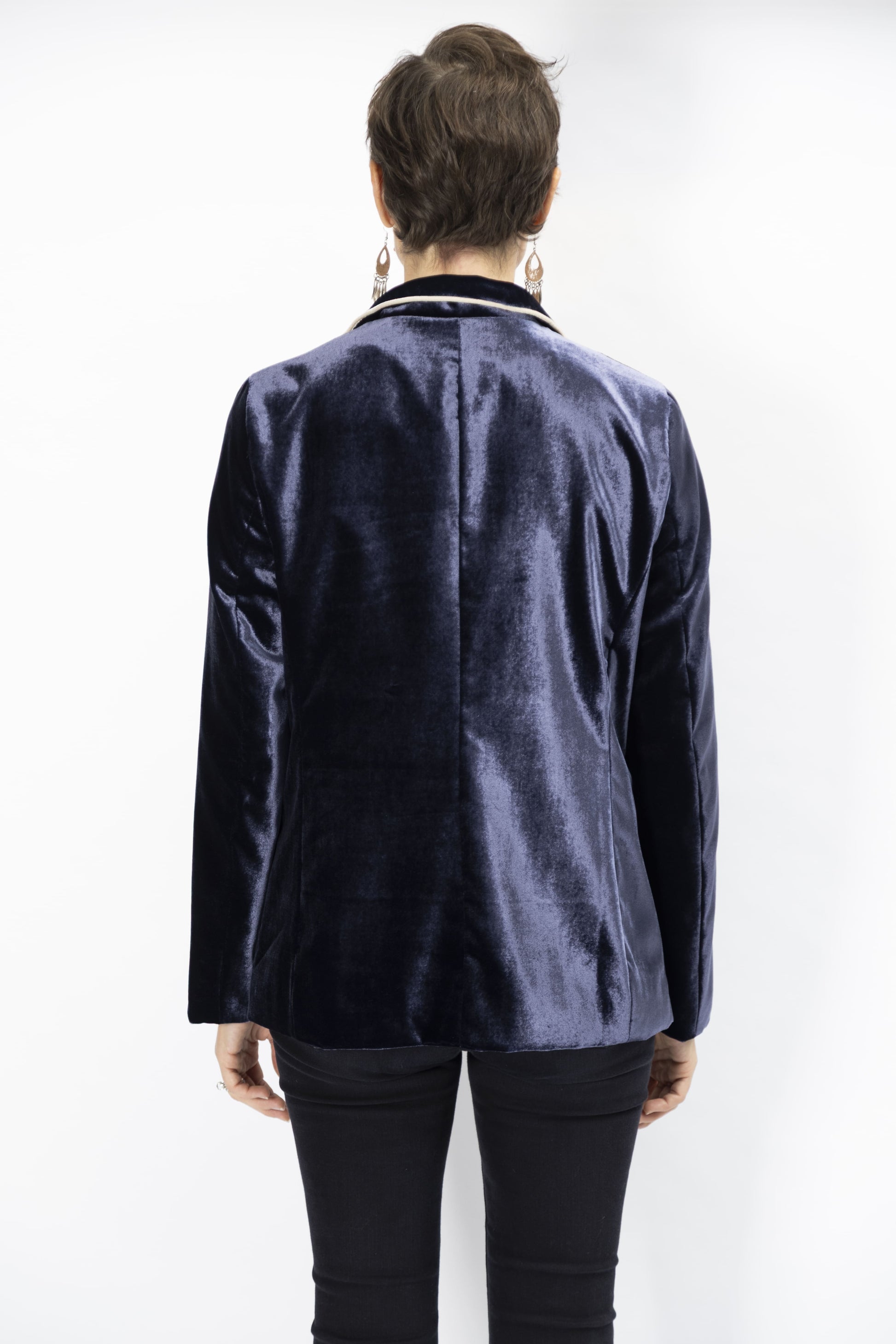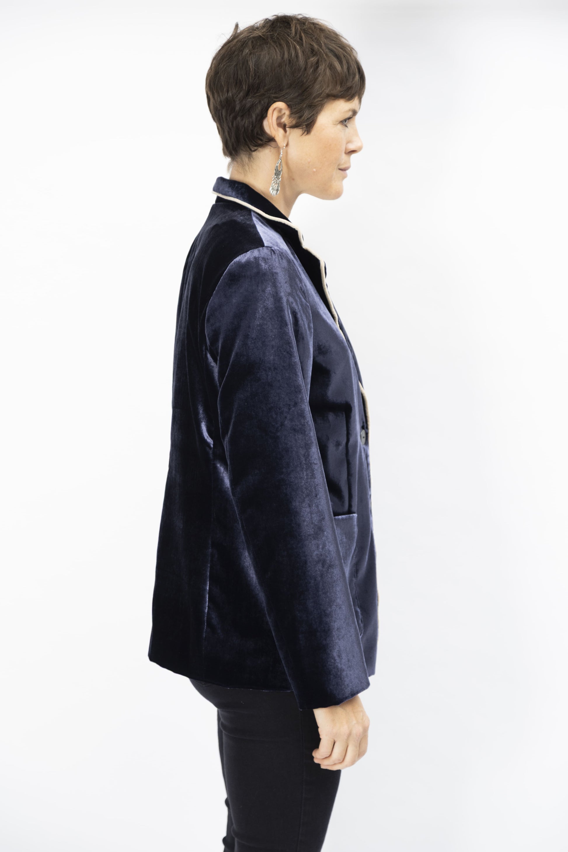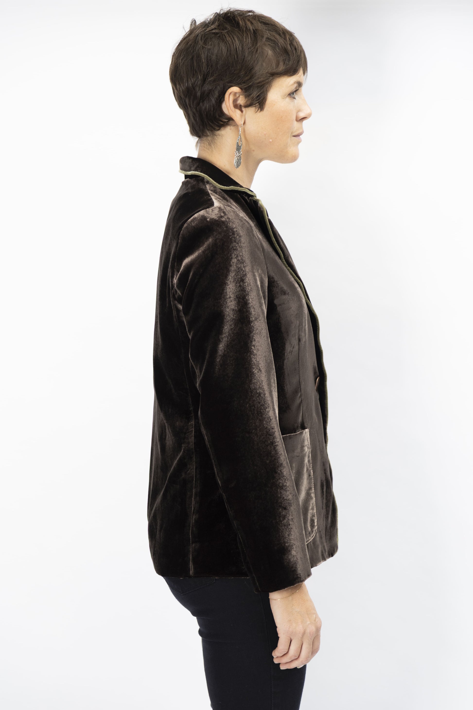 Giacca decostruita in velluto misto seta tinta unita a due bottoni in metallo brunito con tasche a toppa e fodere stampate.